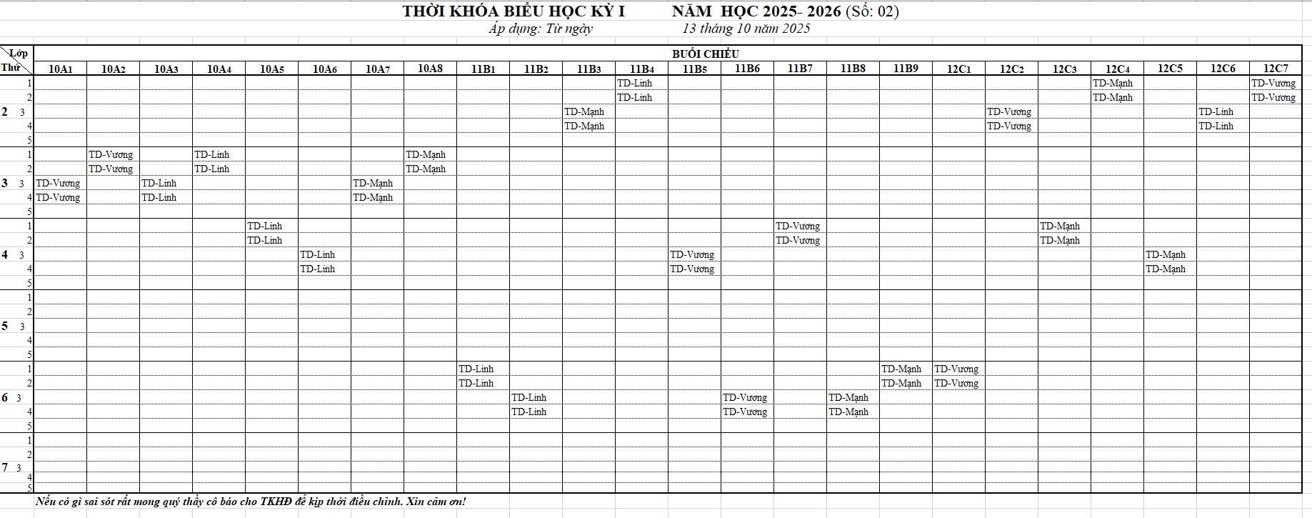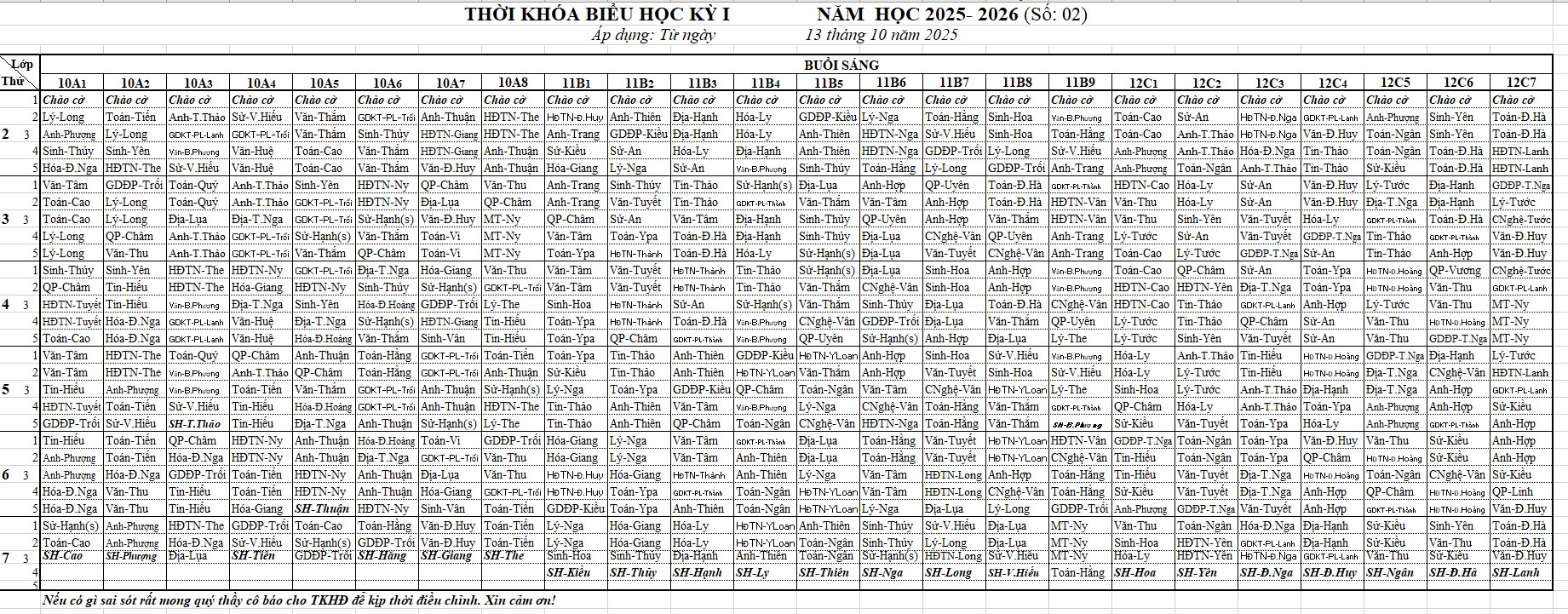 THỜI KHÓA BIỂU HK1 NĂM 2025-2026 ÁP DỤNG TỪ 13/10/2025
